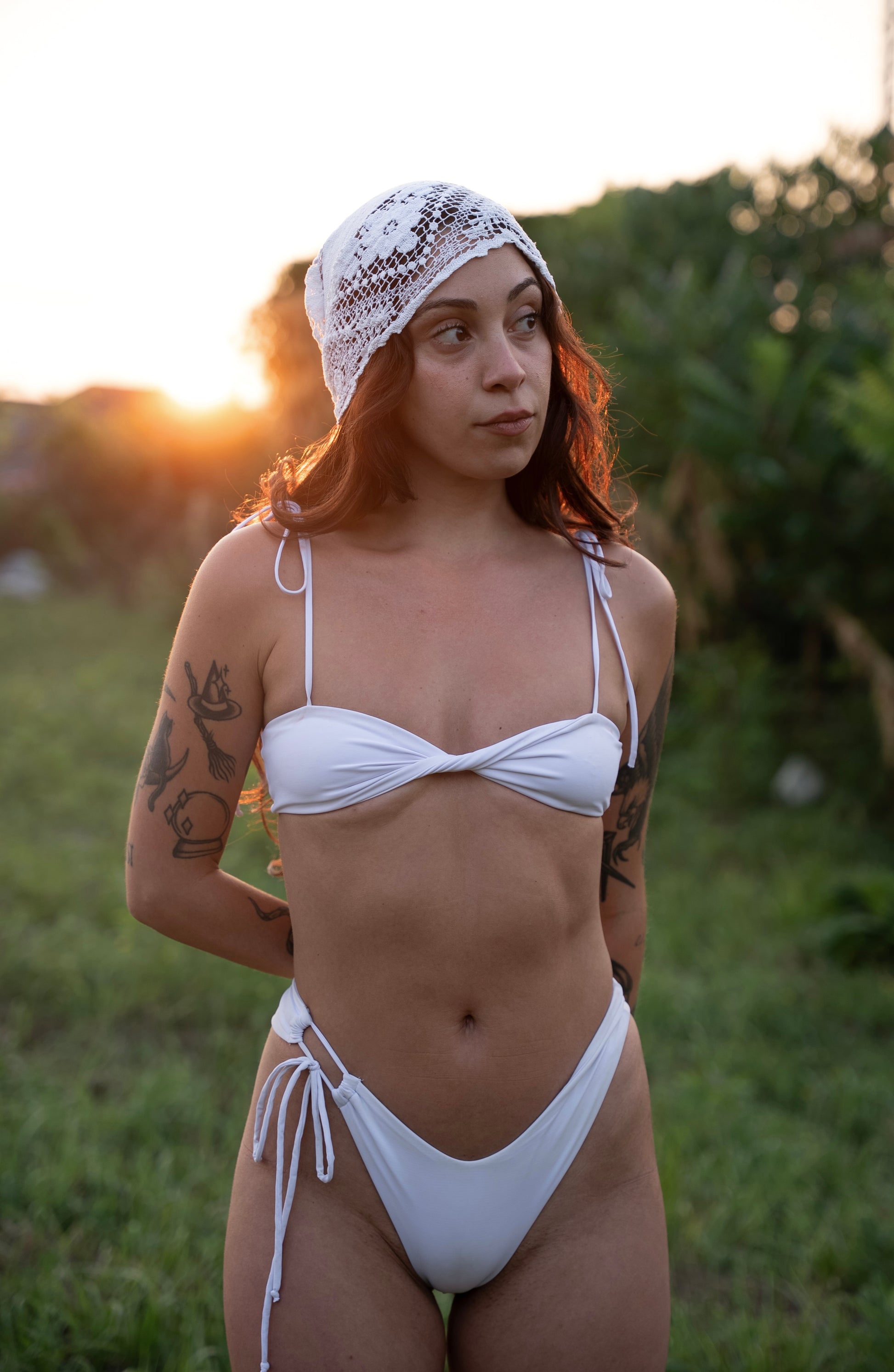 v-cut mid coverage bottoms, double lined with keyhole tie on right hip